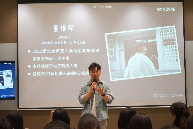 第五环节是就职于高德地图的地理学部校友介绍自己的所属部门、工作日常和感想体会。校友从自己选择工作的心路历程出发,建议同学们在选择工作时要基于整体的时代背景、适当从自己的性格与追求出发,在日后工作中也要对工作充满热情热爱。同时也鼓励同学们在认真完成科研任务的情况下积极参与工作实习,以便更好的对自己的就业去向和职业发展做出评估和规划。