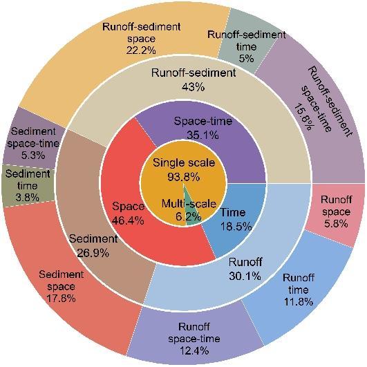 图8 全球SIRSD研究中水沙运移时空尺度问题分布 (多尺度研究中嵌套设计研究仅占全部SIRSD研究的2.3%)