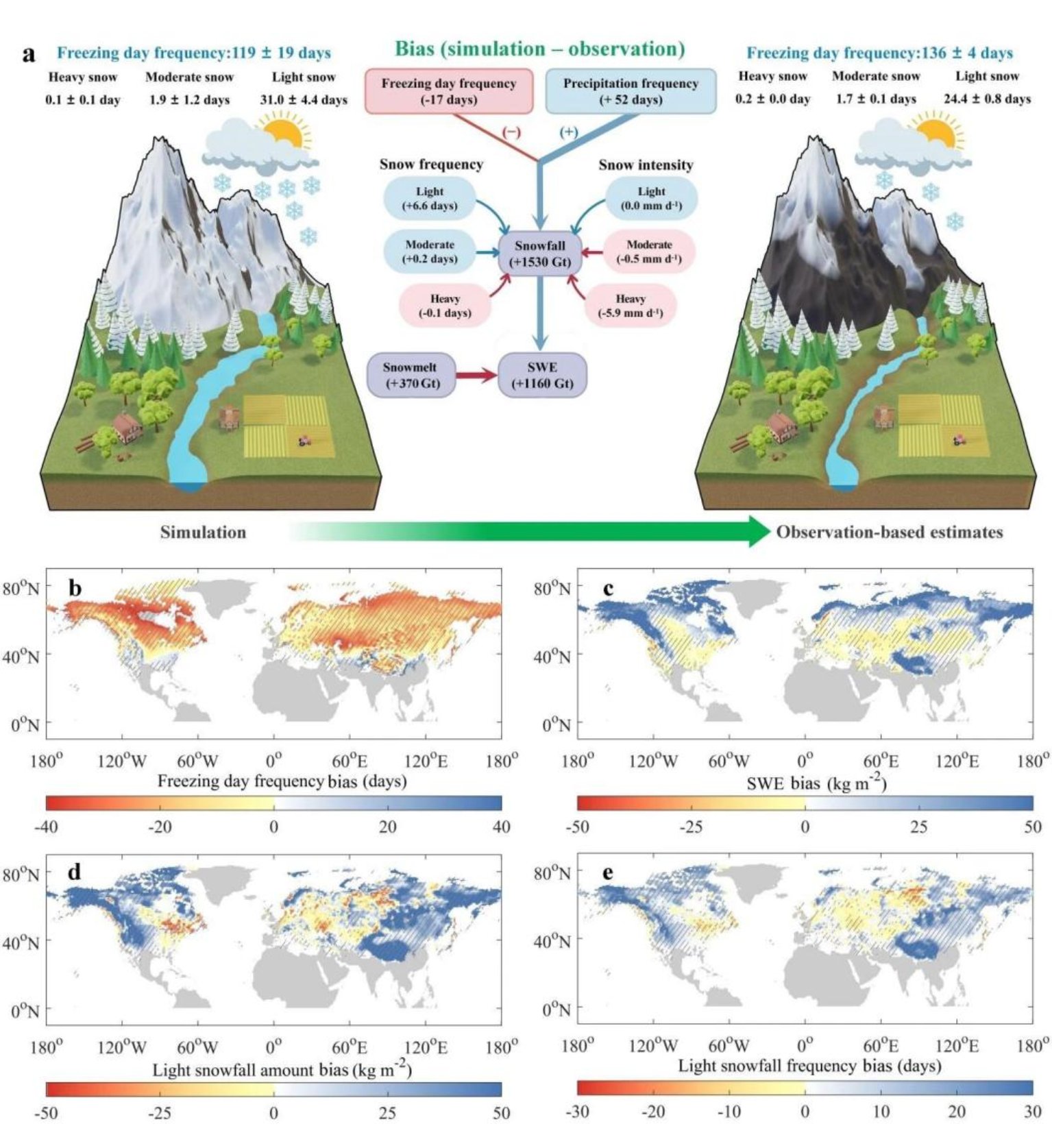 研究首先指向水危机风险认知的源头——未来预测的偏差。 团队聚焦关乎全球数十亿人口水源的北半球积雪,发现当前气候模型普遍存在“雪水资源悖论”:一方面低估寒冷天数,另一方面却高估积雪量。究其根源,模型过度模拟了“小雪”事件(频率高估27%),导致对未来雪水资源的预测存在核心误差(图1)。为此,团队创新性地开发了一套空间校正方法,成功将未来积雪预测的不确定性显著降低了25%-62%,为全球水资源评估提供了关键的修正工具,相关成果发表于《Nature Climate Change》。