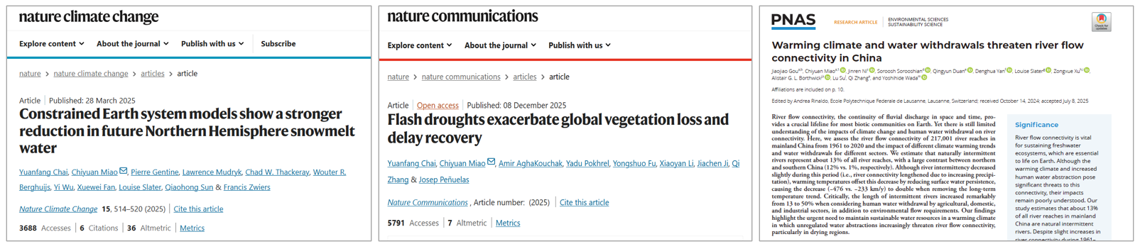 这一系列研究不仅深化了对气候变化下水文风险连锁效应的科学认知,也为制定更具韧性的水资源管理策略提供了关键决策依据。三篇研究成果已于2025年分别发表于《自然·气候变化》《自然·通讯》和《美国科学院院刊》,均以老司机论坛 为第一完成单位,缪驰远教授为唯一通讯作者。