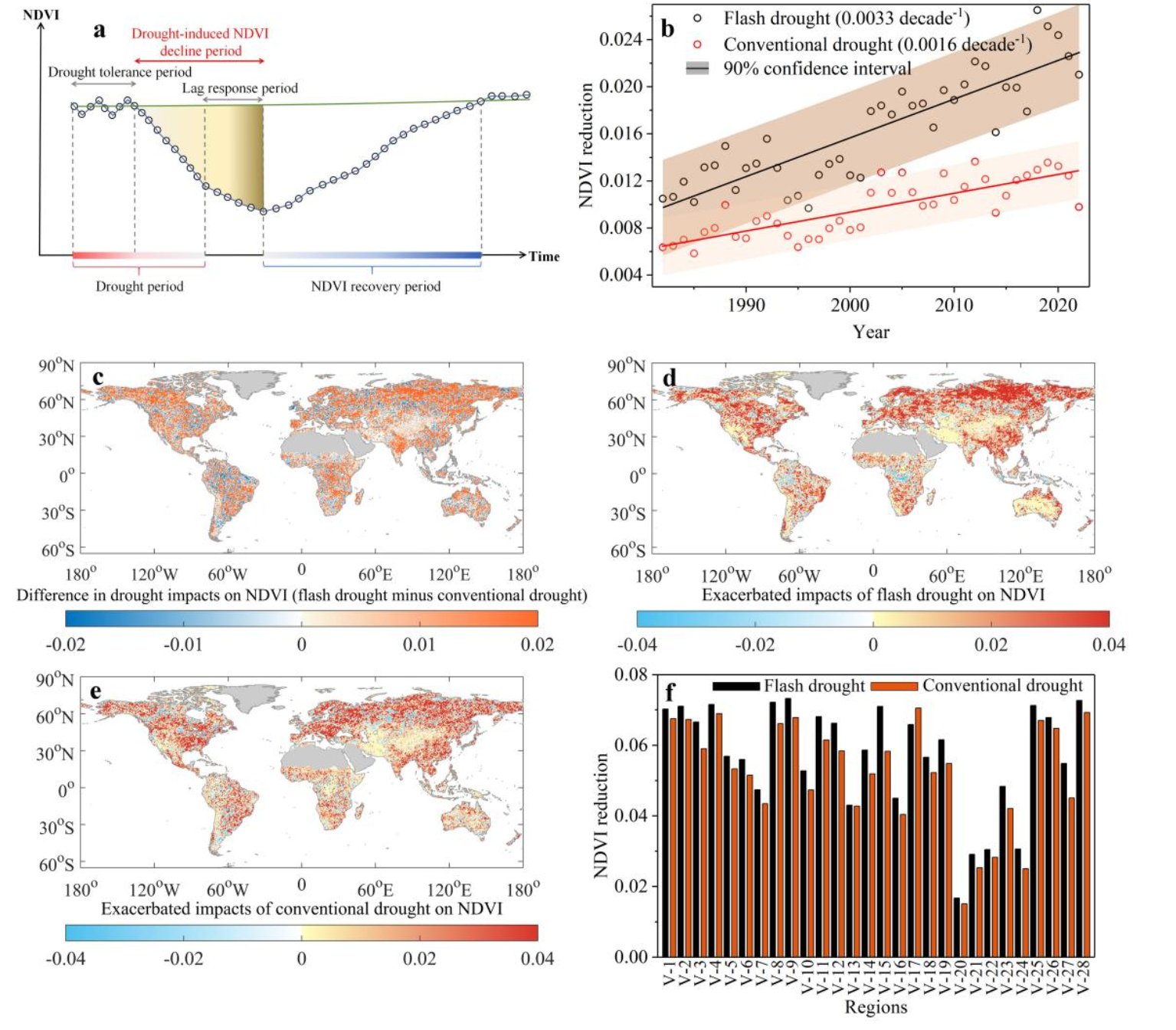 在修正预测模型的基础上,团队揭示了正在加速爆发的“新型水文灾害”——骤旱。 与传统干旱不同,骤旱以周为单位迅速爆发,发生更频繁、强度更大。研究发现,骤旱导致的植被损失幅度可达传统干旱的1.5倍(图2)。过去几十年全球干旱引发的植被损失加剧,超过80%可归因于骤旱发生频率的增加。更值得警惕的是,全球生态系统的恢复力持续下降,干旱后植被恢复所需时间正以每十年增加2天的趋势延长,这对全球碳循环与生态安全构成了深层威胁。该机制性研究发表于《Nature Communications》。