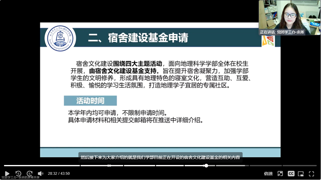 接下来,余淅老师向同学们介绍了宿舍文化建设基金的具体内容、申报流程以及经费支持和奖励。旨在提升宿舍凝聚力,营造互助、互爱、积极、愉悦的学习生活氛围,形成具有地理特色的寝室文化,打造地理学子宜居的专属社区。活动由老司机论坛 本、研宿舍长联盟执行主席执行负责。