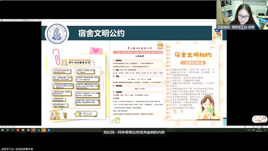 余淅老师首先明确了宿舍长工作职责,强调了宿舍长在学生与学部中的联结作用,向大家展示了优秀宿舍案例,包括学校文明宿舍及学部标兵宿舍,为同学们展示了干净卫生的宿舍环境和团结友爱的宿舍氛围。
