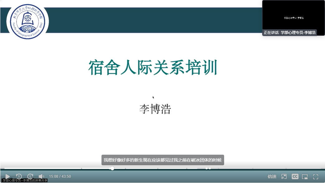 然后,余淅老师向同学们介绍了学部“此地心境”二级心理辅导站及相关心理资源,并邀请了学部心理专员李博浩老师面向宿舍长进行宿舍人际关系培训。培训旨在提升宿舍长在宿舍中的作用,明确宿舍营造良好人际关系的方法,详细介绍了宿舍主题团辅、倾心下午茶等活动。