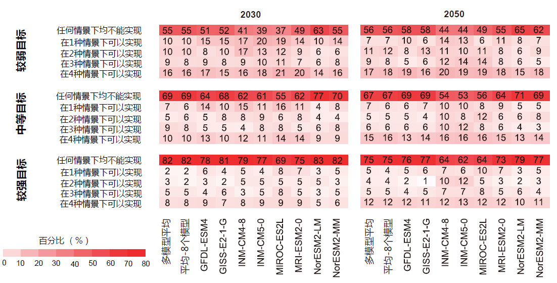 研究发现未来全球实现SDG3.9依然存在很大的挑战。即使是在最理想的模型中,基于最宽松的标准,全球也有超过1/3的国家无法在任何情景下实现SDG3.9。多个模型的平均结果表明,超过三分之二的国家(107/154)到2030年难以将DAPP下降20%以上,即难以实现SDG3.9的中等目标。当将“实质性减少”的定义放宽到10%(即弱目标)时,实现SDG3.9的挑战仍然存在,超过50%的国家(87/154)在任何情景下都无法在2030年实现SDG3.9。当将目标(30%)收紧时(即强目标),有80%的国家(127/154)未能实现。同时,各个模型分开的分析也显示类似的结果(图2)。