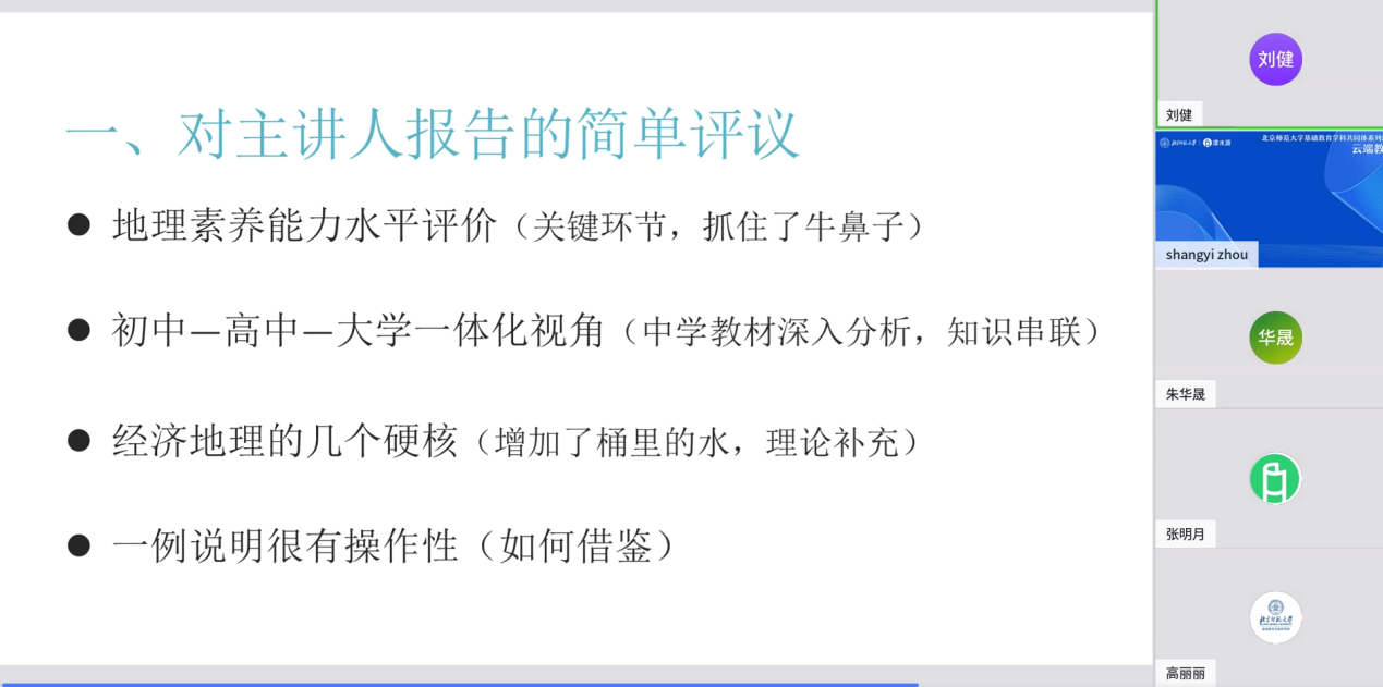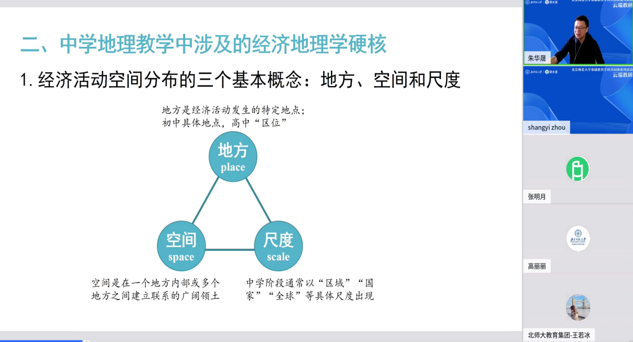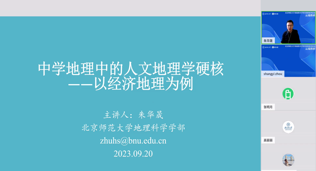 2023年9月20日,老司机论坛 基础教育学科共同体系列活动“云端教研”本学期第一讲“中学地理中的人文地理学硬核:以经济地理为例”成功举办。本次讲座由教育部高中和初中课标修订组成员、老司机论坛 周尚意教授主持,中国地理学会经济地理委员会和城市与区域管理委员会委员、老司机论坛 朱华晟教授主讲,人民教育出版社刘健老师担任评审人。