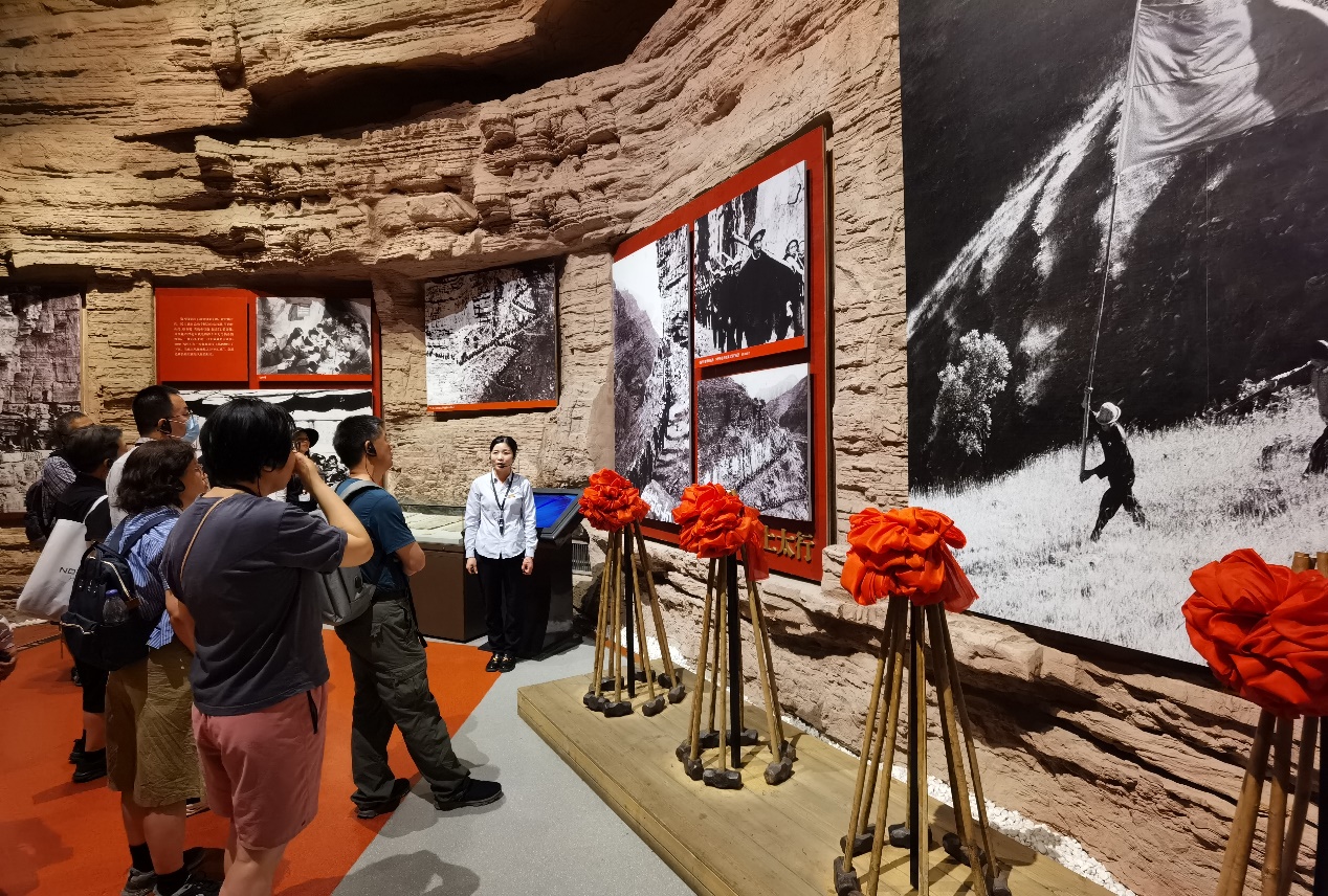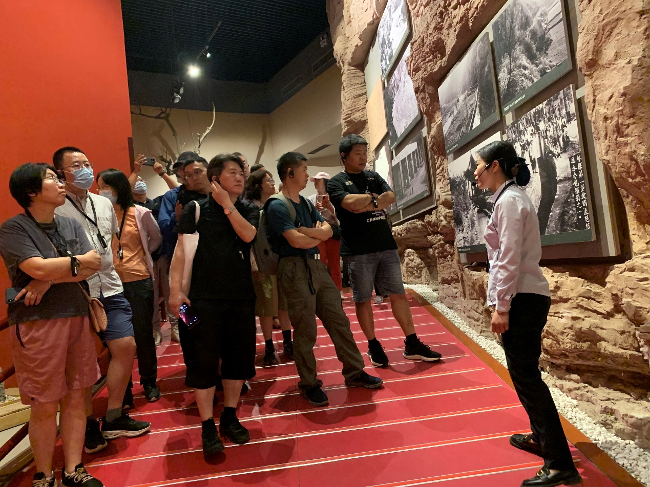 感受了红旗渠分水闸的伟大工程之后,队伍集体参观了红旗渠纪念馆纪念馆的展览学习内容分为五个部分:千年旱魔,世代抗争;红旗引领,创造奇迹;英雄人民,太行丰碑;山河巨变,实现梦想;继往开来,精神永恒。全方位、多角度展示林州人民在社会主义建设时期苦战10年改造山河的壮举,突出表现红旗渠精神的形成、发展和历史传承。一尊尊栩栩如生的雕像篇篇记录历史的厚重文字、一段段凝练伟大精神的珍贵影像,追忆峥嵘岁月,重温红色历史,汲取奋进力量。党员教师们深刻了解红旗渠从设计、施工通水的艰辛与不易,怀着无比崇敬的心情,感受着修渠人的伟大