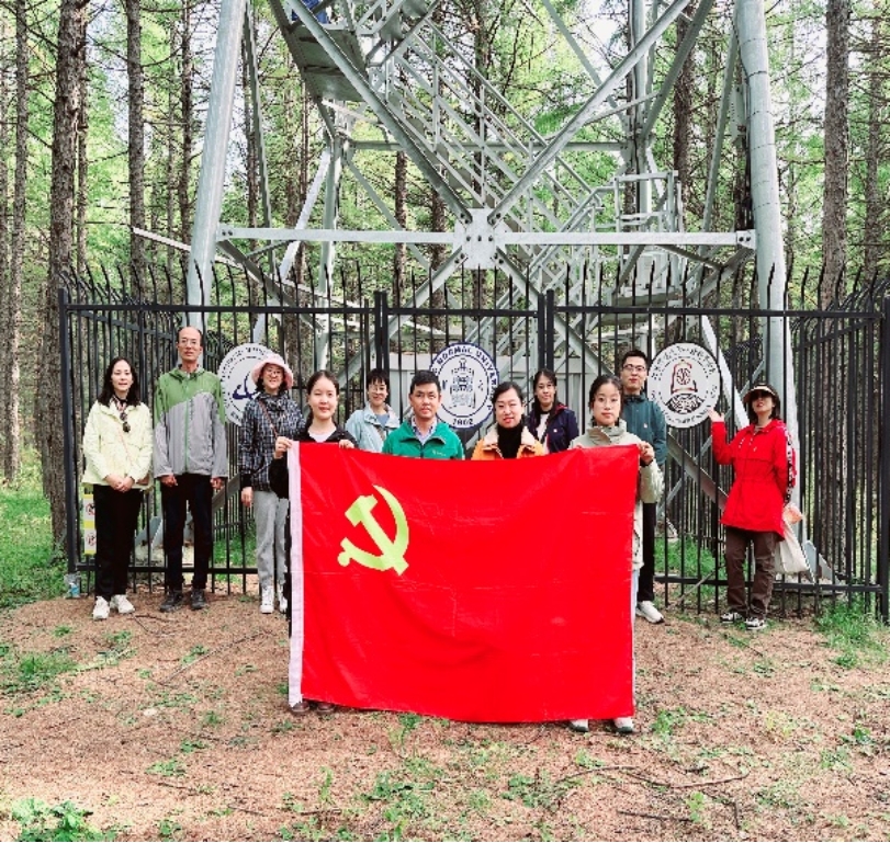 穆西晗老师带领党员同志们参观了位于落叶松林的观测塔、位于月亮山的辐射观测站点和北京大学生态站。穆老师是观测塔的建设全程的亲历者和建设者之一,他介绍说,从2013年李小文院士揭牌,到2020年破土动工,在学部、遥感科学国家重点实验室、机械林场、河北林草局等多方大力支持下,建成了三座观测塔。塔高40米,在不同高度布设了涡度相关、叶绿素荧光、自动气象站等碳通量相关仪器,为科研提供长期定位观测数据。依托实验场获得星-机-塔多平台观测数据,已发表高水平学术论文74篇,完成博士学位论文14篇,硕士学位论文18篇。正如习总书记所说,“要把学问做在祖国大地上”,期待未来为服务“双碳”和生态文明建设的国家战略发挥更大的作用。