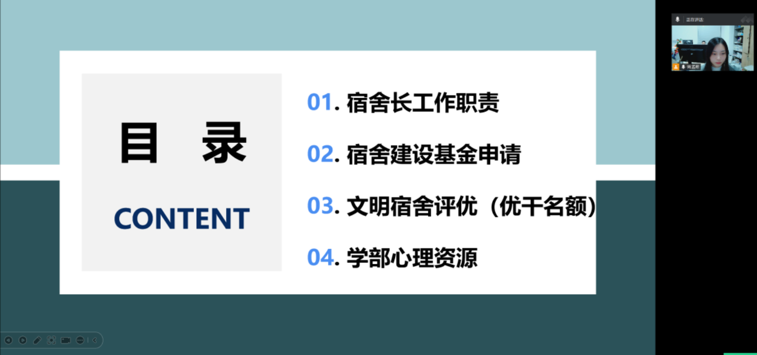 胥孟希老师围绕宿舍建设核心工作展开系统讲解,首先明确了宿舍长需承担通知传达、信息统计、安全监督、卫生管理、文化建设等关键任务的工作职责;其次介绍了学部的宿舍建设基金活动及文明宿舍评选的流程和内容;随后强调了要密切关注宿舍成员身心健康与学业状况,及时反馈异常情况,筑牢宿舍安全稳定防线。为宿舍长们提供了兼具理论性与实操性的工作指引,助力大家高效履职。