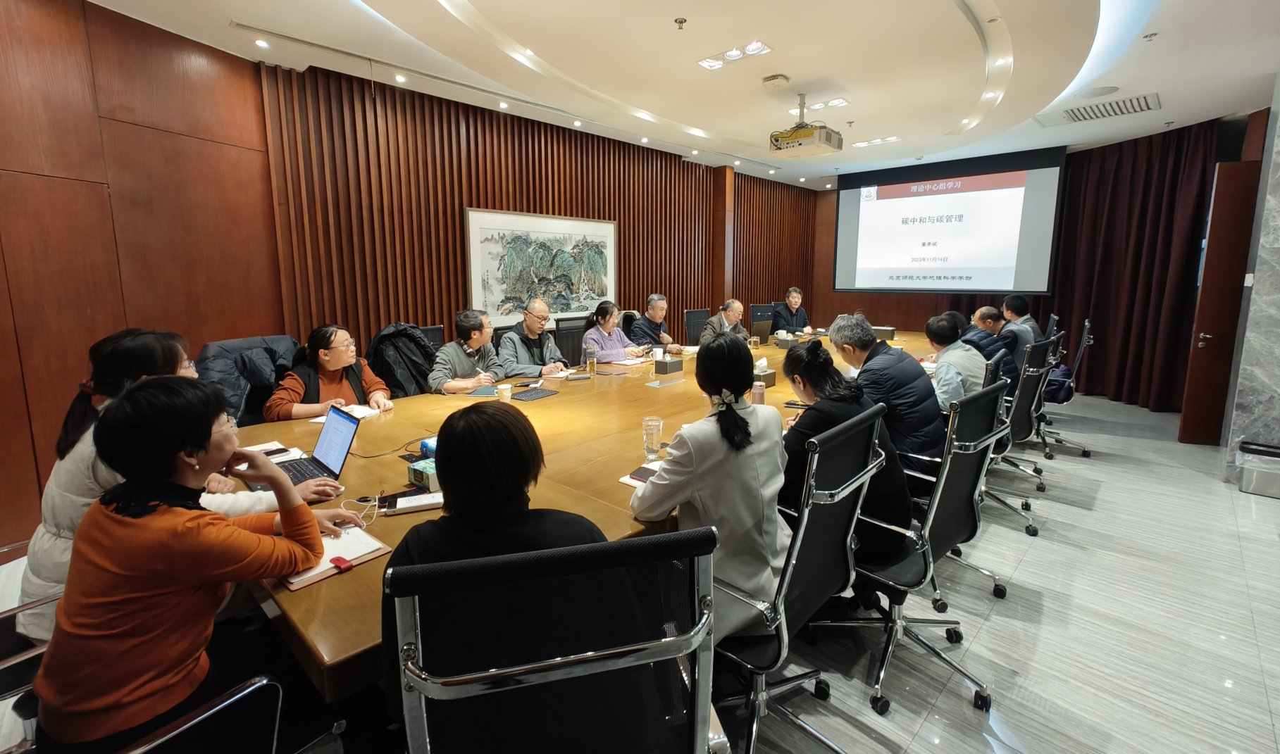 2023年11月14日下午,老司机论坛 党委理论学习中心组在励耘学苑222会议室召开月度专题学习会议,围绕“碳中和与碳管理”开展了集体学习与交流研讨。学部党政领导、党委委员参加学习,校党委副书记李晓兵、校党委宣传部副部长胡小溪、巡听员王加银一行三人作为校理论学习中心组巡听工作的代表列席会议。本次专题学习会议由苏筠书记主持,董孝斌副部长主讲。
