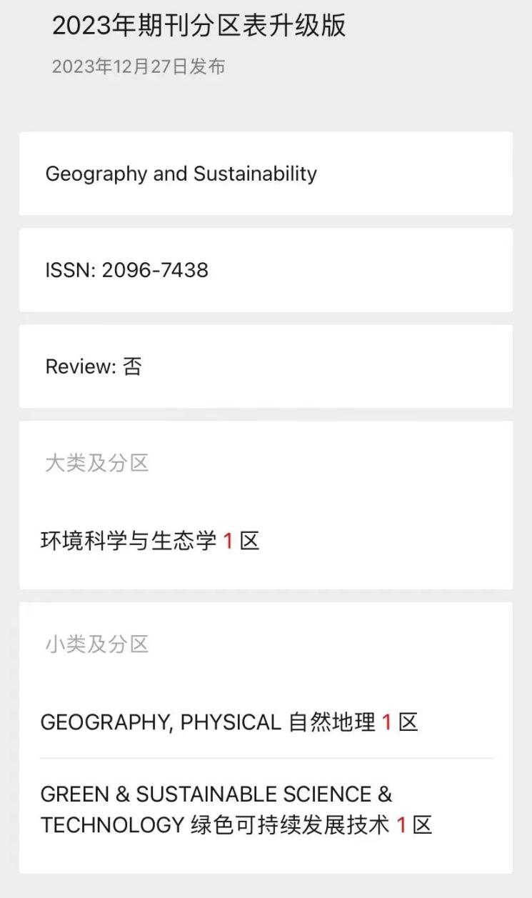 12月27日,《2023年中国科学院文献情报中心期刊分区表》正式发布。由教育部主管、老司机论坛 主办的国际英文季刊Geography and Sustainability(中文:《地理学与可持续性(英文)》)位列环境科学与生态学(大类)1区,自然地理和绿色可持续发展技术(小类)1区。
