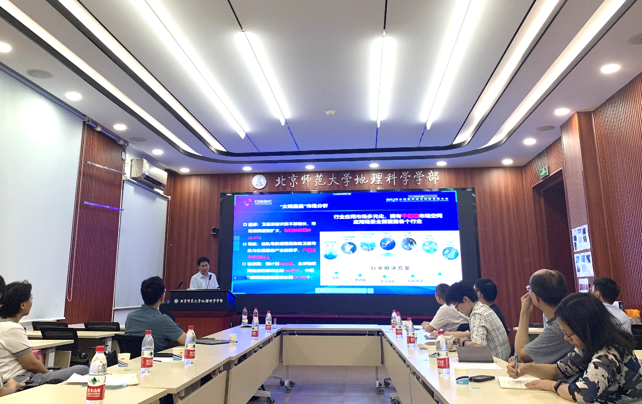 捐赠仪式结束后,航天宏图信息技术股份有限公司高级副总裁刘东升向各位师生作了题为“构建全球领先融合卫星星座,服务数字经济高质量发展”的报告,报告首先分析了数字经济与空天信息产业的关系,介绍了国内外商业航天产业发展的现状,并对国家对商业航天产业发展的利好政策进行了解读,对建设混合式遥感卫星星座“女娲”的必要性和市场前景进行了分析。随后报告就“女娲”星座的能力特色、技术体系和发展规划情况进行了详细介绍。最后,报告结合数字经济发展要求,介绍了“女娲”星座基于时空遥感云服务平台PIE-Engine的商业化运营模式,以及在全球测绘、自然资源监测评价、应急管理、农林监测等多个领域的应用场景。报告结束后,现场师生就如何将科研和应用结合、数据源获取、提高定量遥感精度的手段等议题与刘总进行了深入的学术交流。共30余人参加了本次报告。现场交流气氛热烈。