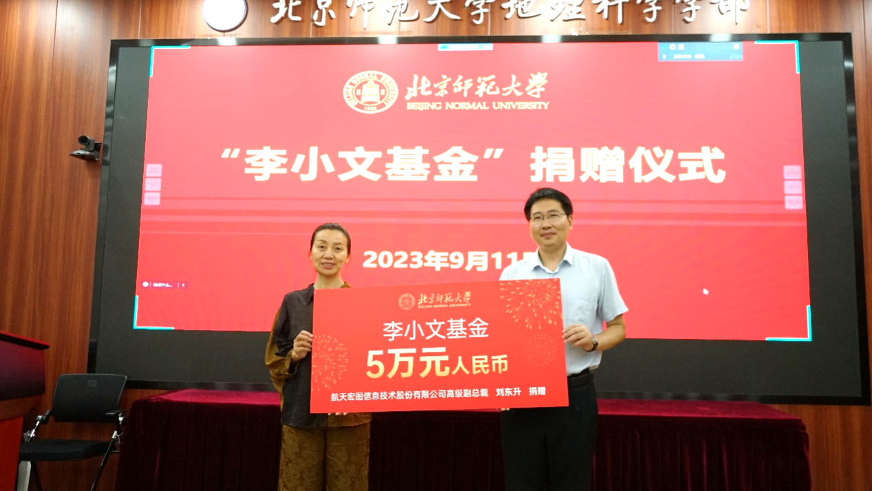 仪式上,李胜兰秘书长代表学校教育基金会接受刘东升高级副总裁的捐赠,宋长青教授代表李小文基金向刘东升颁发捐赠证书,并赠送纪念品。