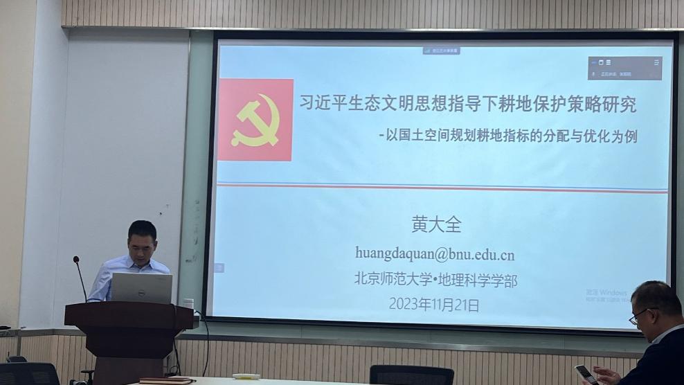本次党课以习近平生态文明思想为指导,围绕生态文明建设、耕地保护重大战略需求与新时代地理学的关系,以国土空间规划耕地指标的分配与优化为例,从地理视角阐述生态文明背景下耕地保护策略。黄大全教授的党课报告结合近年开展的研究工作,从引言、分析框架、研究区域、数据和方法、研究结果和讨论与结论五个部分依次展开。报告中,黄大全教授强调耕地保护事关国家粮食安全,探讨了不同资源禀赋、粮食产销功能分区耕地保有量指标空间分配格局和分配策略的差异性,以及多政府层级在耕地保护指标分配的作用和影响因素,分析了指标分配策略的合理性和指标失效的原因。这些宝贵的研究结果,有助于完善国土空间规划耕地指标分配实施与管理,保障我国耕地资源的数量和质量。