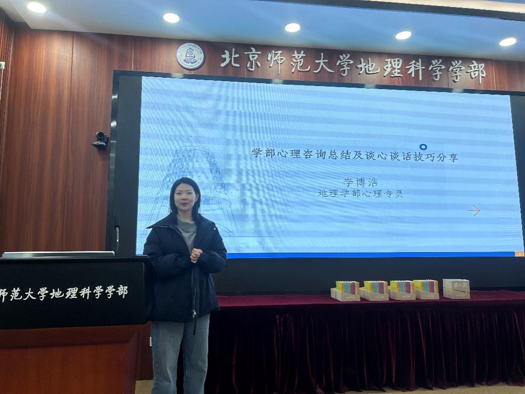 会议第一部分,由心理专员李博浩对本学期学部心理咨询情况进行总结,包括个体咨询情况和团体心理辅导情况,对学生不同阶段的常见心理问题进行分析,并通过总结当代大学生特征讲解了与学生谈心谈话时的沟通技巧。