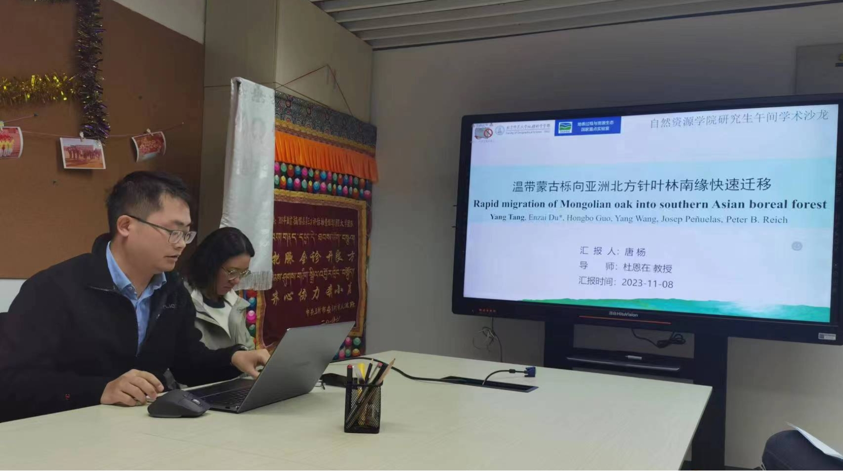 唐杨同学的汇报题目为“Rapid migration of Mongolian oak into the Southern Asian boreal forest”,采用野外调查采样与室内测试分析相结合的方式,发现随着气候变暖,蒙古栎迅速向南方北方森林迁移。温带-北方森林交错带树种迁移速率高于高山数线和极地苔原带,蒙古栎是温带-北方森林交错带迁移较快的树种等结果。同时他也从气候障碍、扩散障碍和生物障碍三个方面解释了蒙古栎的迁移机制。最后唐杨同学也分享了自己在撰写论文时的心得,要坚持,清楚自身研究采样方法、数据分析的优缺点,以及科学问题是否匹配能否充分验证等。与会同学也对唐杨同学的汇报结果进行了讨论。