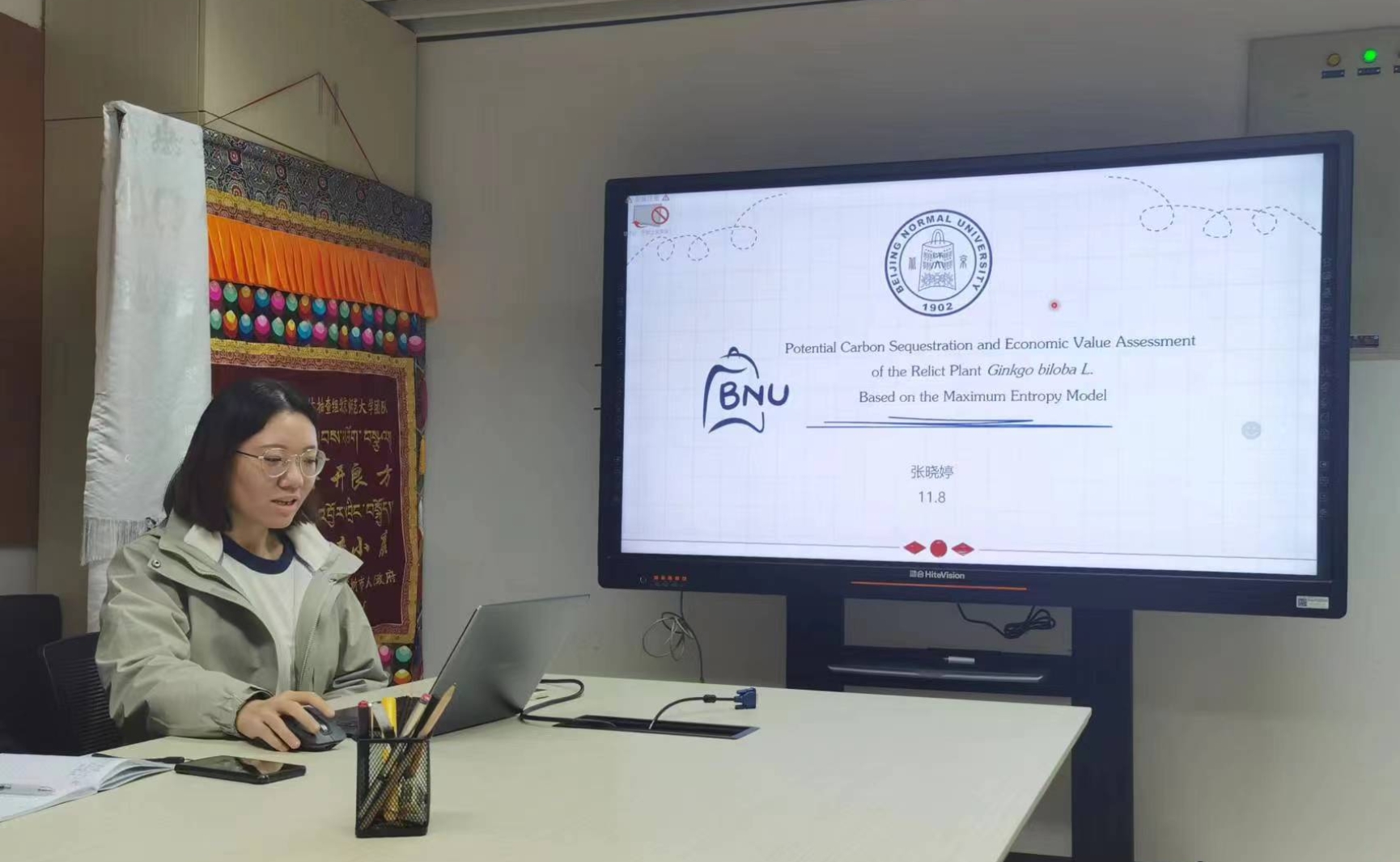 张晓婷同学的汇报题目为“Potential carbon sequestration and economic value assessment of the relict plant Ginkgo biloba L. based on the Maximum Entropy Model”,银杏是一种具有较高固碳能力的树木,是适合城市生态系统的优势树种之一,张晓婷同学通过模型预测9种气候情景下银杏的潜在适宜面积、固碳量和碳汇价值的变化,为城市绿化树种的资源利用和碳汇值的实现提供参考。张晓婷同学汇报结束后,同学们就研究中数据获取、模型等方面开展了讨论。