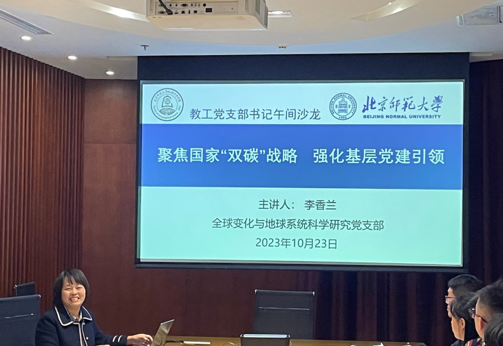 会议第三项,全球变化与地球系统科学研究党支部的支书李香兰老师为与会人员带来“聚焦国家‘双碳’战略,强化基层党建引领”的主题讲座。李老师首先从气候变化与国家碳中和的大背景出发,重点介绍了当前全球的碳排放现状及我国的应对举措;其次,解读了二十大报告中关于国家双碳的最新部署,以及积极稳妥推进碳达峰碳中和的现实意义;此外,结合她本人在北京市大兴区挂职锻炼期间的工作经验,分享了大兴区在减污降碳减排方面的创新举措和工作实效;最后,从拓展校地合作新模式等方面交流了自己在强化基层党建引领方面的个人思考。