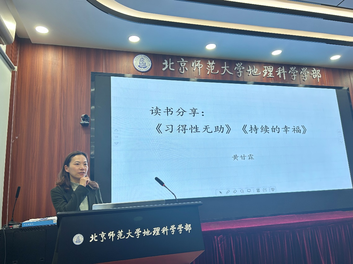 会议第二部分,由班主任黄甘霖老师进行心理健康读书分享。黄老师结合自身班主任工作经历,向各位老师分享了阅读《习得性无助》和《持续的幸福》两本书的体会,展示了对两本书的理解和思考,与会教师均受益匪浅。
