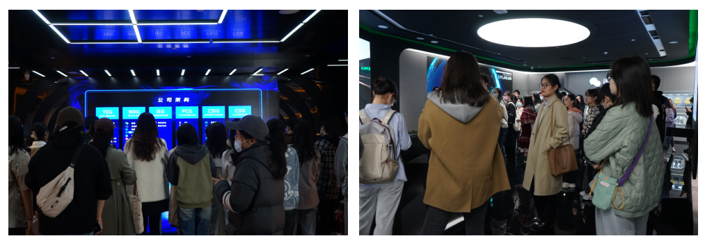 进入展厅前,工作人员为大家讲解了总部大楼的整体设计,突出“绿色、健康”的设计理念。随后,工作人员带领大家开启了腾讯之旅——参观公司展厅。