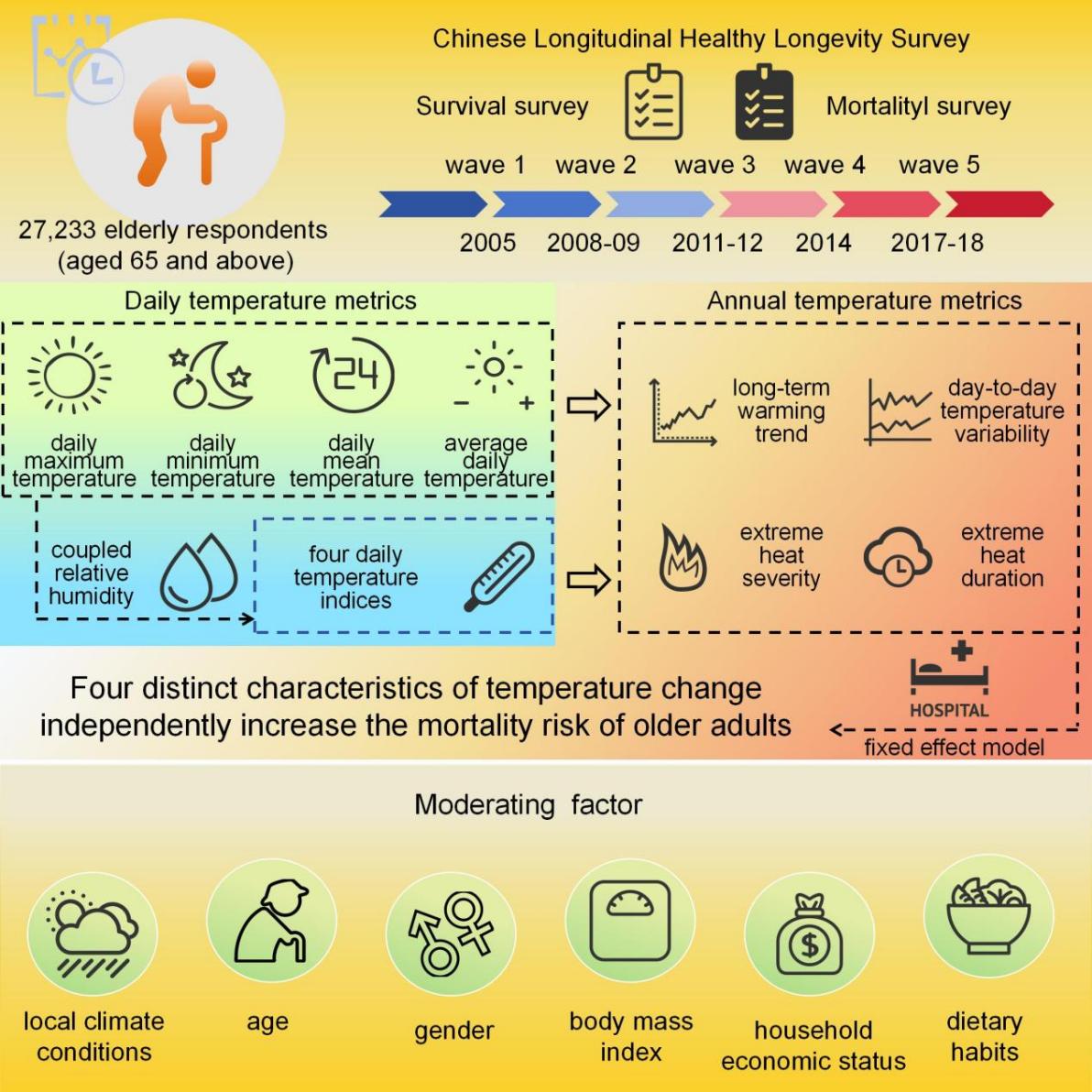 随着全球气候持续变暖,极端高温频发,对人类健康尤其是老年人造成了威胁。气温变化的健康效应在不同时间尺度和特征维度上存在异质性,然而,现有研究主要关注短期气温变化(如几周内)对人类死亡风险的影响,忽略了气温不同特征的长期变化(如多年尺度)对人类死亡风险的潜在影响。