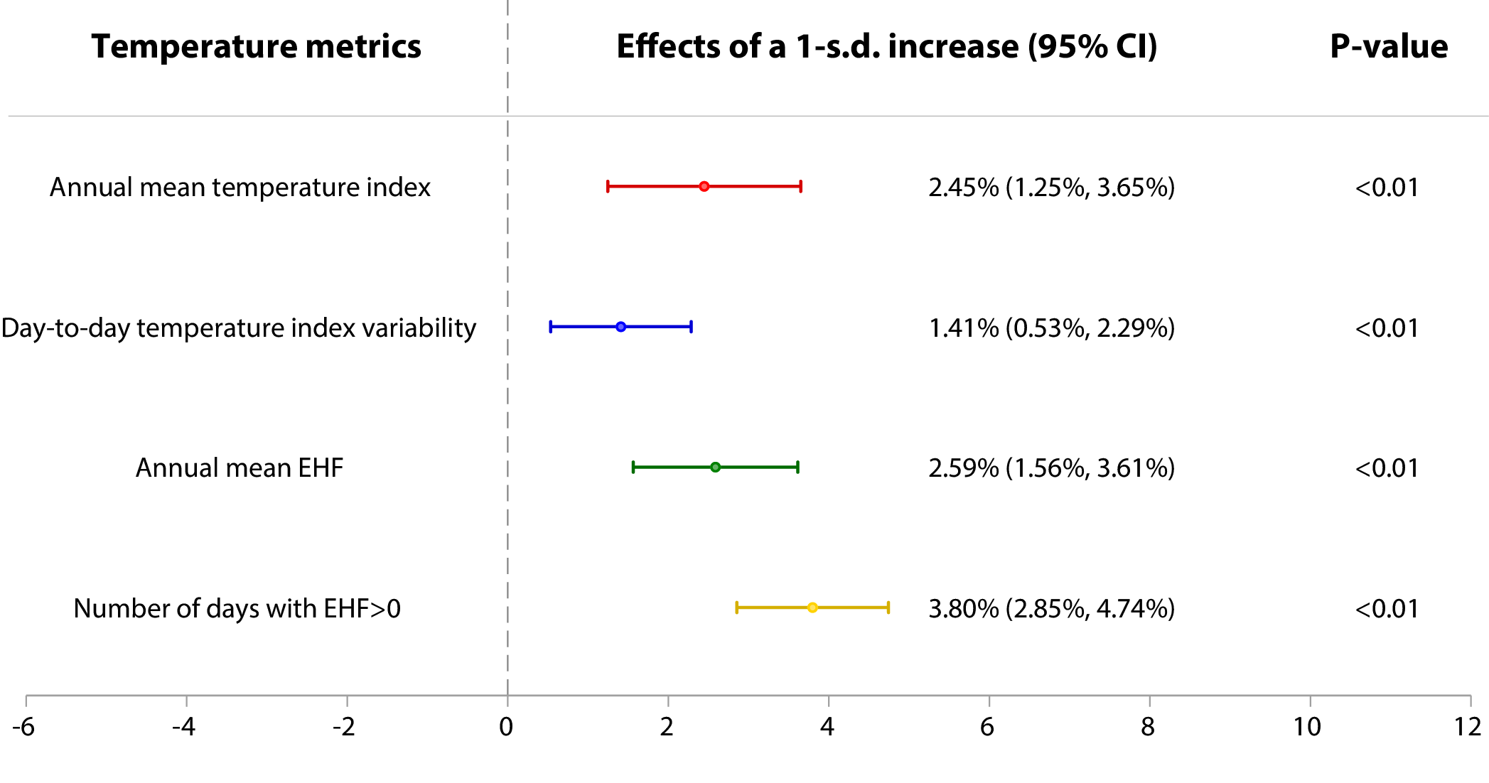 基于2005年至2018年中国27,233名65岁及以上老年人的纵向健康长寿调查数据,采用高维固定效应模型,量化了气温变化对老年人死亡风险的影响。结果表明,长期气温变暖、短期气温波动、极端高温事件的强度增加以及持续时间的延长均会独立增加老年人的死亡风险(图2)。除短期气温波动外,其它三种气温变化的影响存在与当地气候状况高度相关的区域异质性。