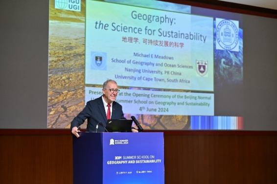 Michael Meadows院士对暑期学堂的举办表示热烈祝贺。他提到,地理学为人类社会做出了积极贡献,特别是在当今世界全球可持续发展面临诸多挑战的背景下,为土地退化、气候变化、贫困、生物多样性减少等问题的解决提供了可行方案。