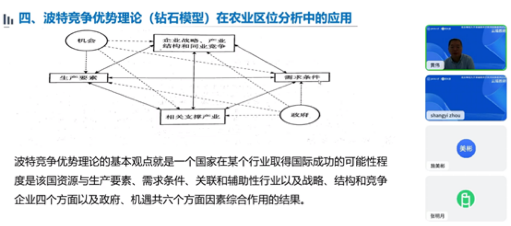 讲座第二节是区域农业地理的分析框架。黄伟教授剖析了农业的概念和农业地理学的发展历程,同时黄伟教授进一步分享了一些农业区位分析的关键理论,其中包括杜能的农业区位地租模型和波特竞争优势理论(钻石模型)在农业领域中的具体应用。