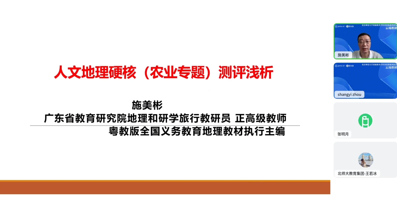 活动的第二环节,由施美彬老师作关于人文地理内容测评的主题发言。施老师指出,黄伟教授的报告思想深邃、内容丰富、原理深刻让老师们受益匪浅。在农业地理专题的教学中,要聚焦农业地理原理的学习和新时代农业现代化、农业发展等新问题,培育学生地理核心素养。施老师结合题目案例,运用农业地理原理分析相关农业问题,解析命题立意和能力要求,帮助老师们理清教学要求。最后,施美彬老师结合广东省学科教研,提出中学地理教学要根据新课标新要求,转变教与学方式,开展跨学科主题学习、项目式学习、深度学习,通过研学实践促进地理学科知识与其它学科知识的融合贯通,培养学生综合素质,发挥地理学科实践育人价值。