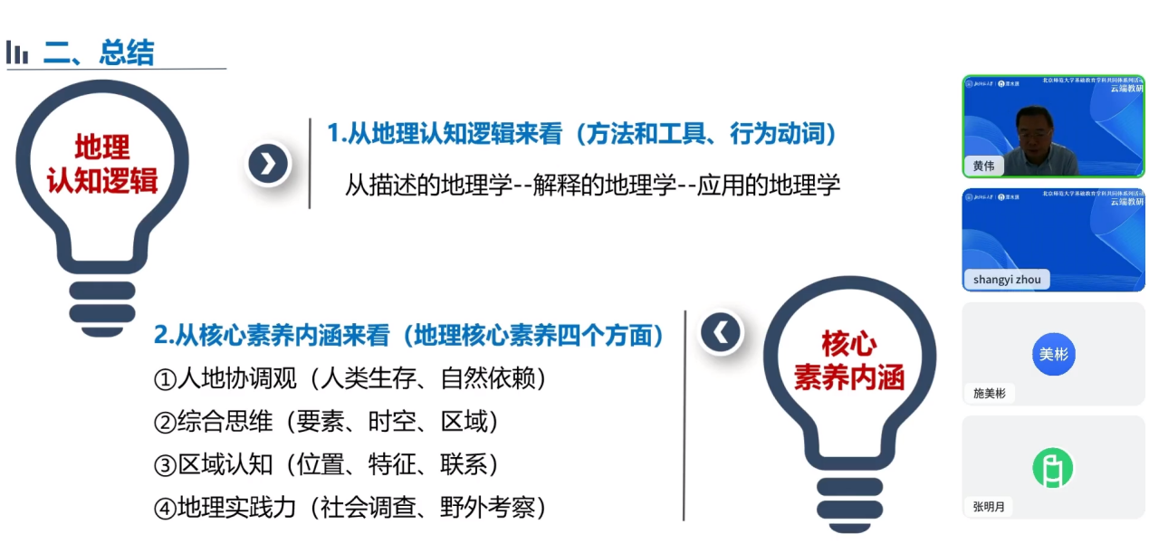 本次讲座的主要目的与第一次讲座“中学地理中的人文地理学硬核——以工业地理为例”有紧密的衔接,同时还有新的拓展。线上参会的教师不仅有附属学校的老师,还有多名老司机论坛 北京校区和珠海校区的人文地理老师、以及其他在老司机论坛 参加国培项目的中学老师。与会者在最后的互动环节踊跃发言,提出的非常有质量的问题,教师们也做了深入的解答。