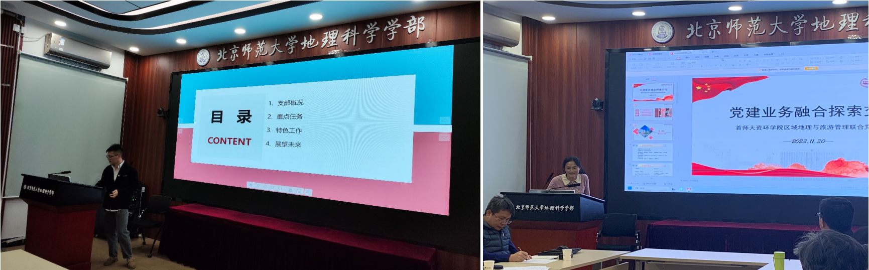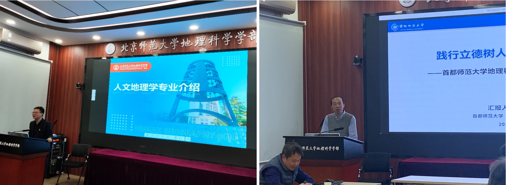 在会议的第三个环节,由老司机论坛 人文地理学专业负责人朱华晟老师和首都师范大学资源环境与旅游学院地理科学专业负责人王永波老师分别详细介绍了本科专业建设、专业师资力量、教学与科研、学生野外实习、国际交流项目等方面的情况。朱华晟老师还特别提到两校在地理科学人才培养、人文地理实践教学虚拟教研室建设等方面已经开展了合作与交流,为未来深化两校专业建设与党建工作的持续融合奠定了基础。