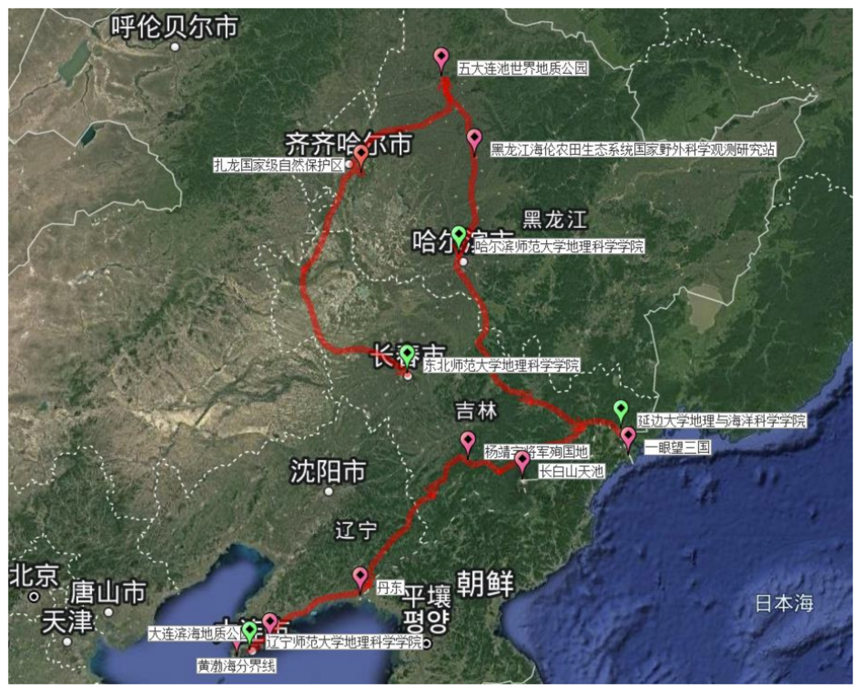 本次联合野外实习在吉林省、黑龙江省和辽宁省进行,总计行程约 3500 公里。实习队伍从长春出发,沿线考察了松嫩平原的河流地貌与过程、湿地生态环境、土壤侵蚀与土地利用、区域自然地理分异、五大连池火山地质地貌等,长白山区域的地质构造背景、河流水系与河口生态、长白山西坡垂直自然带、朝鲜族民俗风貌、区域的可持续发展等,以及丹东至大连的河口地貌与景观、海岸地质与地貌、城市与区域发展等丰富的地理现象,内容涵盖了地质、地貌、植被、土壤、生态、城市规划、人文与区域发展等方面。本次实习深刻感受到了东北地区独特的自然景观与人文风貌,对东北地区不同地貌单元的地域分异性、各种地理现象的要素复杂影响以及作为国家重要粮仓的黑土区特征和问题有了更深刻的认识。