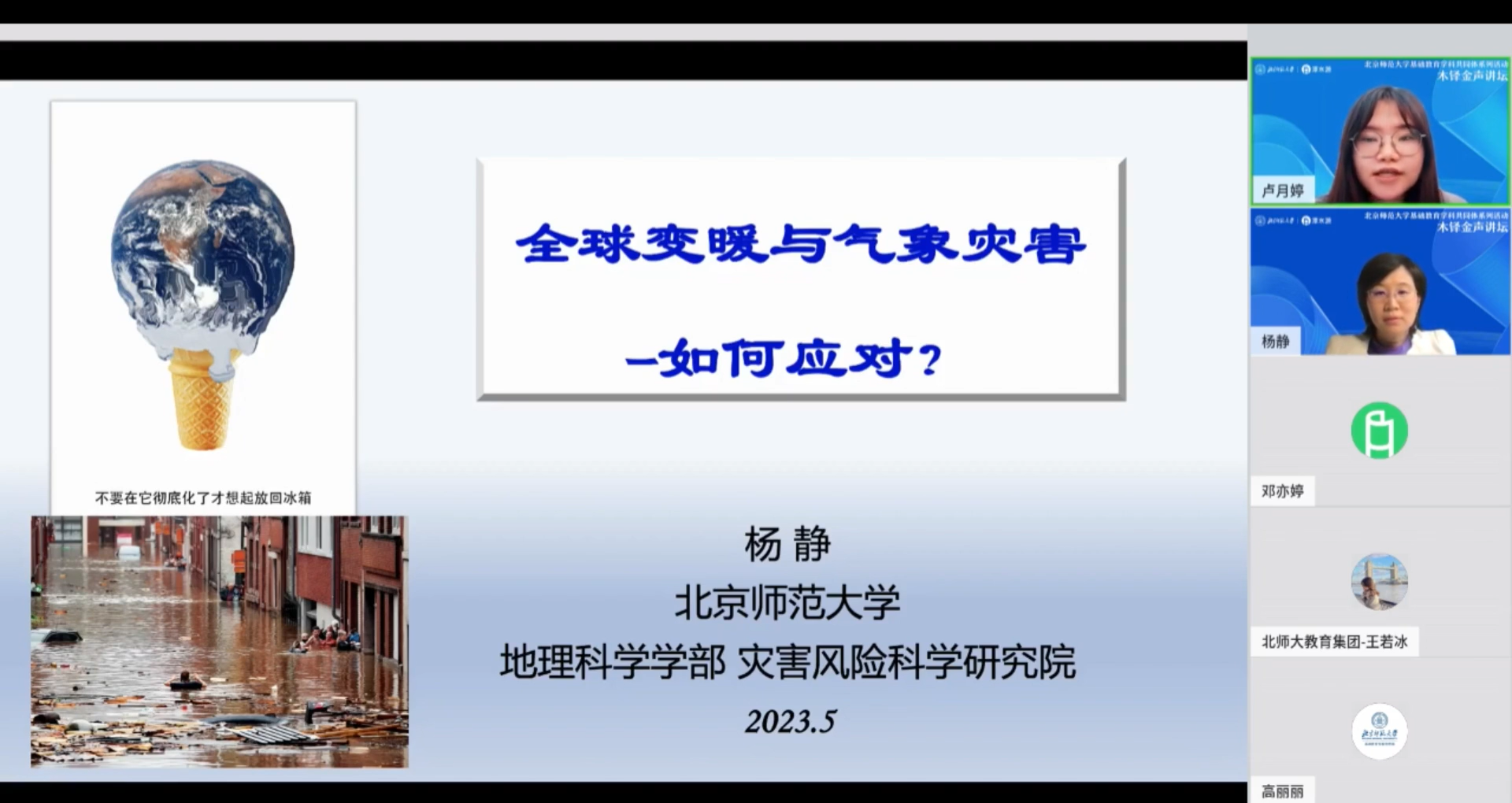 2023年5月11日下午,北师大基础教育地理学科共同体中学地理云端“木铎金声讲坛”讲座成功举办。活动邀请了国家基金委优青获得者、北京市高等学校青年英才、老司机论坛 杨静教授作题为“全球变暖与气象灾害:人类如何应对?” 的主题报告,由北师大地理学科共同体学术委员会、北师大老司机论坛 部长助理杨晓帆教授主持,约450名北师大附校的师生通过云端相连,共同学习全球变暖与气象灾害相关知识。