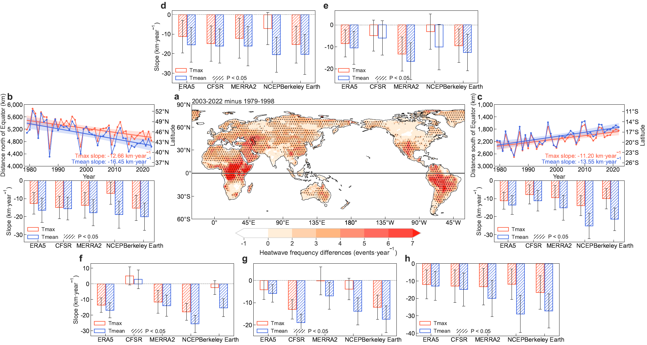 a:2003-2022时段与1979-1998时段陆地热浪年平均频次差异的空间分布;b-c:北半球(b)和南半球(c)陆地热浪平均位置的时间序列(上)及趋势(下);d-h:区域平均(以赤道为界)的热浪平均位置变化趋势,北非欧亚(d)、美洲北部(e)、非洲南部(f)、海洋大陆-澳大利亚(g)和美洲南部(h)。