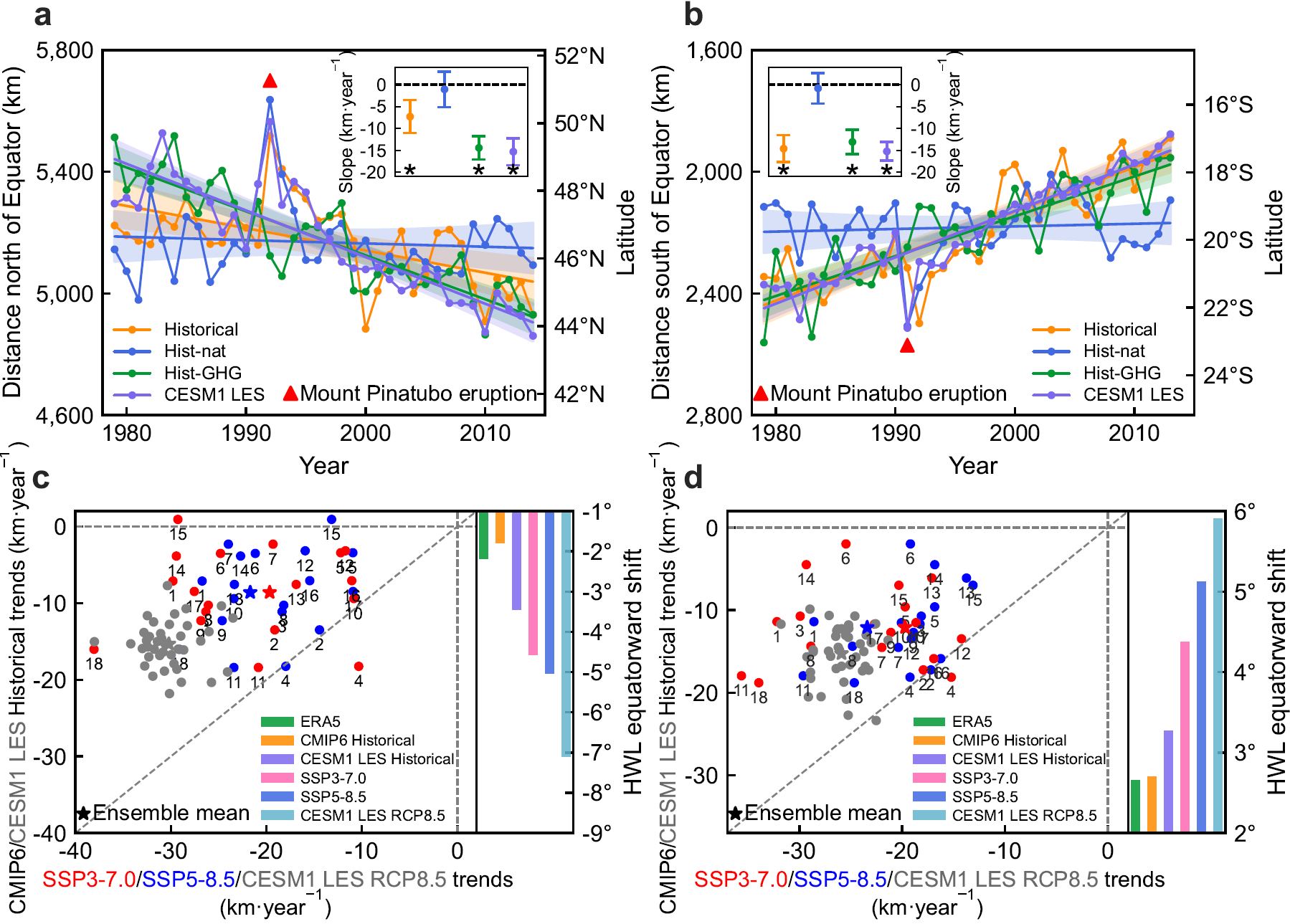 a-b:CMIP6多模式集合平均的历史(橙)、自然强迫(蓝)、温室气体强迫(绿)以及CESM1 LES历史(紫)模拟的1979-2014年北半球(a)和南半球(b)陆地热浪平均位置时间序列及趋势;c-d:SSP3-7.0(红)、SSP5-8.5(蓝)和CESM1 LES RCP8.5(灰)(2065-2100年)情景与历史(1979-2014年)北半球(c)和南半球(d)陆地热浪平均位置变化趋势的对比。柱状图显示热浪平均位置在对应时段前后10年的差异,其中绿色柱为ERA5再分析数据结果,其他彩色柱代表不同情景模拟结果。