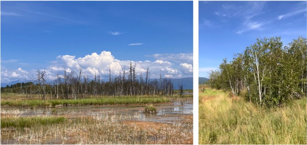 湿地中已经死亡的针叶林和生长的桦树林