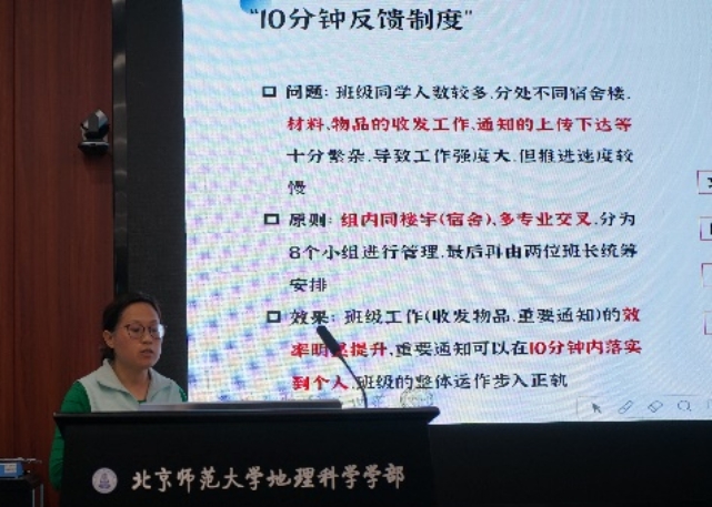 答辩结束后,学部党委书记苏筠老师进行总结发言。苏筠老师对各个班级、各位班主任充分发挥自己的工作特色,因材施教、爱人育人的尝试探索进行了充分肯定,鼓励各位班主任做好下一阶段的工作安排规划,砥砺前行,把握学生思想行为的发展动态,共同推进班级管理工作进一步优化升级。