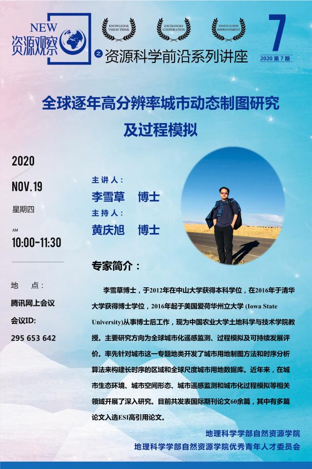 【11月19日讲座】自然资源学院前沿系列讲座第7期 李雪草 博士:全球逐年高分辨率城市动态制图研究及过程模拟