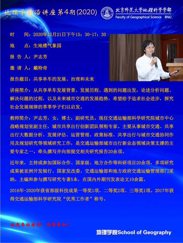 【12月21日讲座】地理学前沿讲座第4期(2020)尹志芳:共享单车的发展、治理和未来