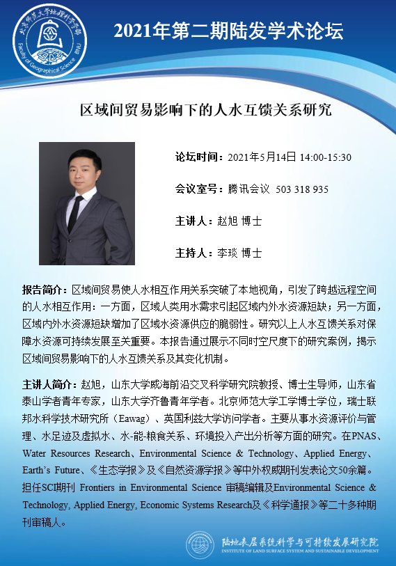 【5月14日讲座】2021年第二期陆发学术论坛,赵旭:区域间贸易影响下的人水互馈关系研究