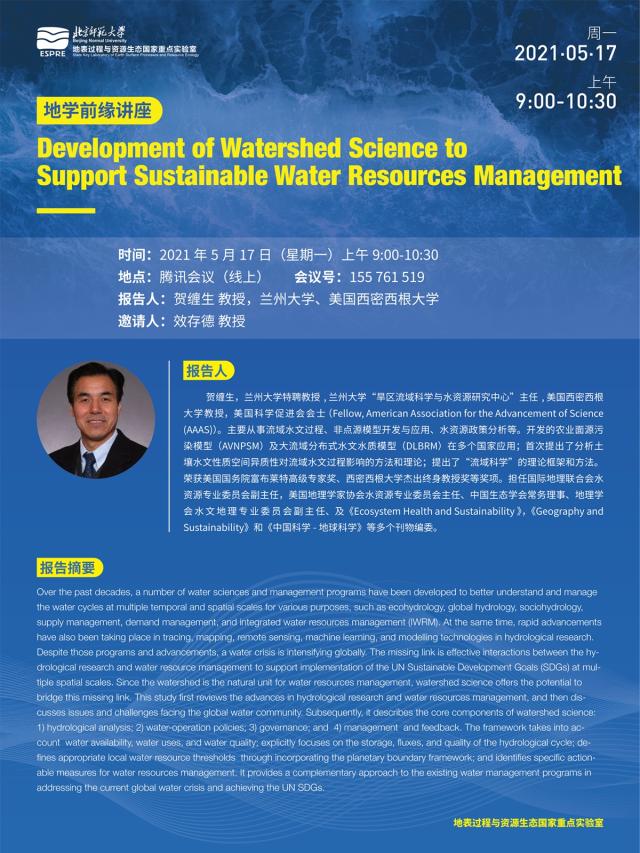 【5月17日讲座】地学前缘讲座,贺缠生:Development of Watershed Science to Support Sustainable Water Resources Management