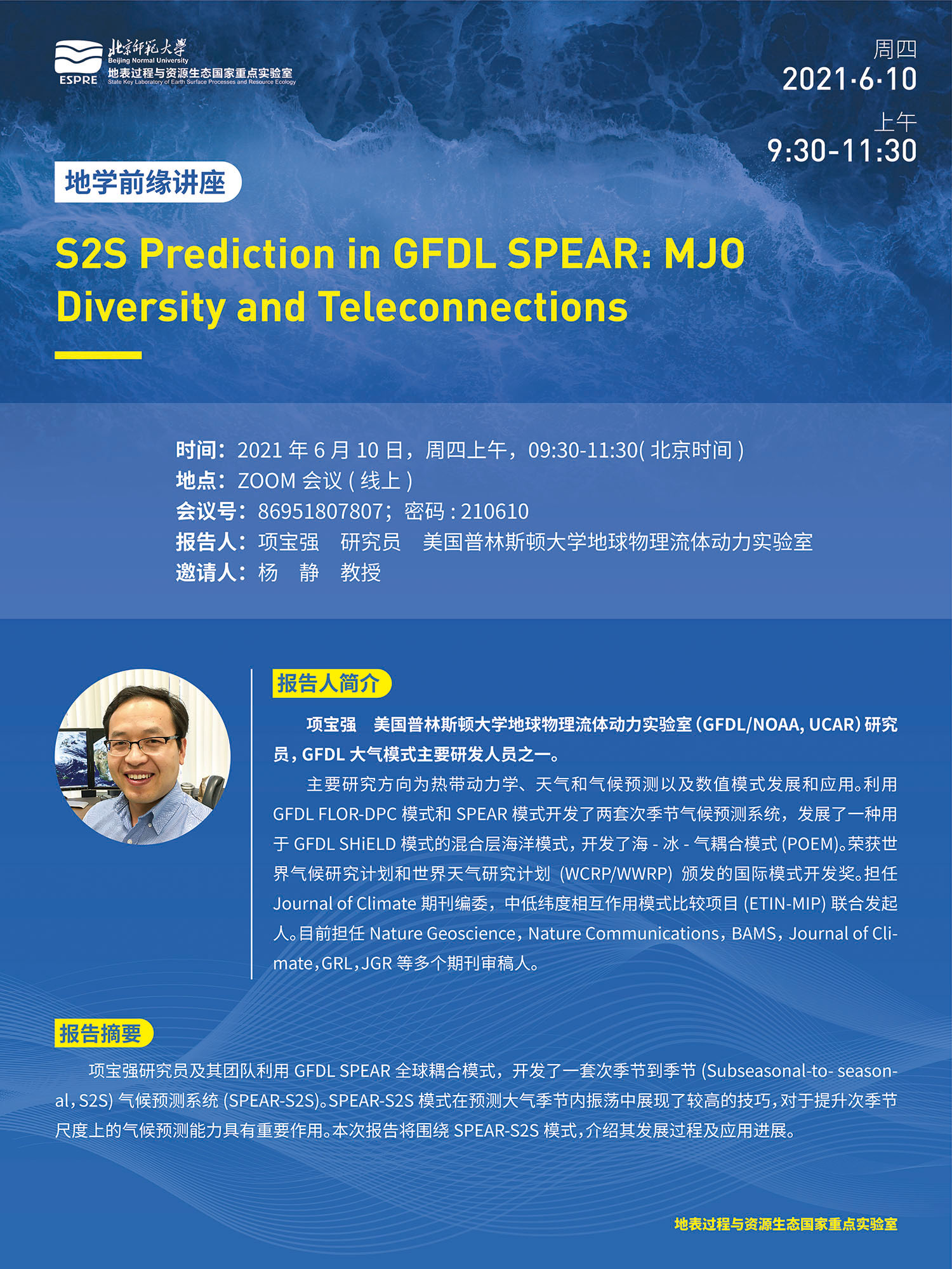 【6月10日讲座】 项宝强 研究员,S2S Prediction in GFDL SPEAR: MJO Diversity and Teleconnections