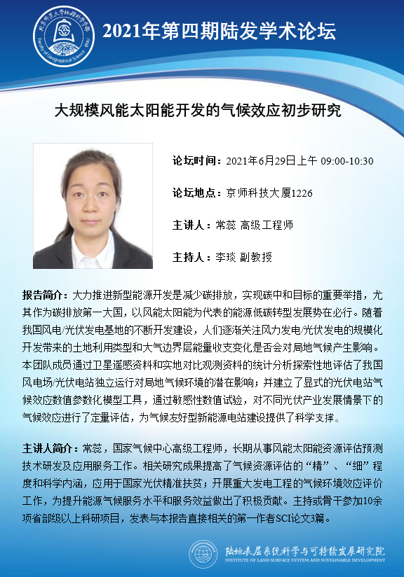 【6月29日讲座】常蕊 高级工程师:大规模风能太阳能开发的气候效应初步研究