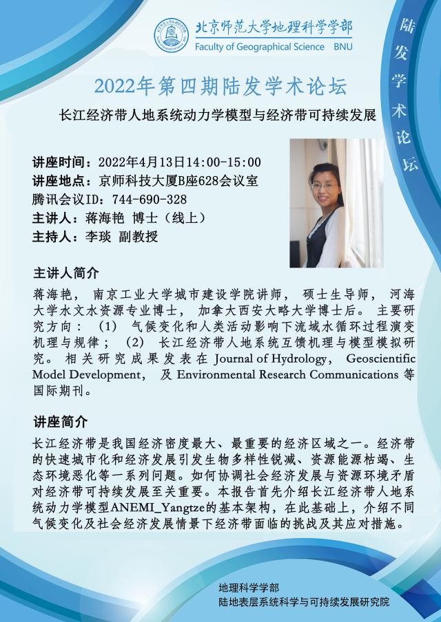 【4月13日讲座】2022年第四期陆发学术论坛:蒋海艳,长江经济带人地系统动力学模型与经济带可持续发展