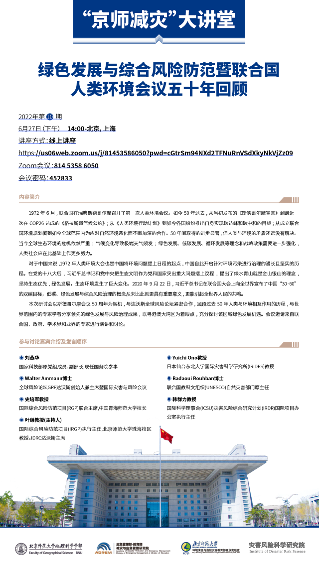 【6月27日讲座】绿色发展与综合风险防范暨联合国人类环境会议五十年回顾