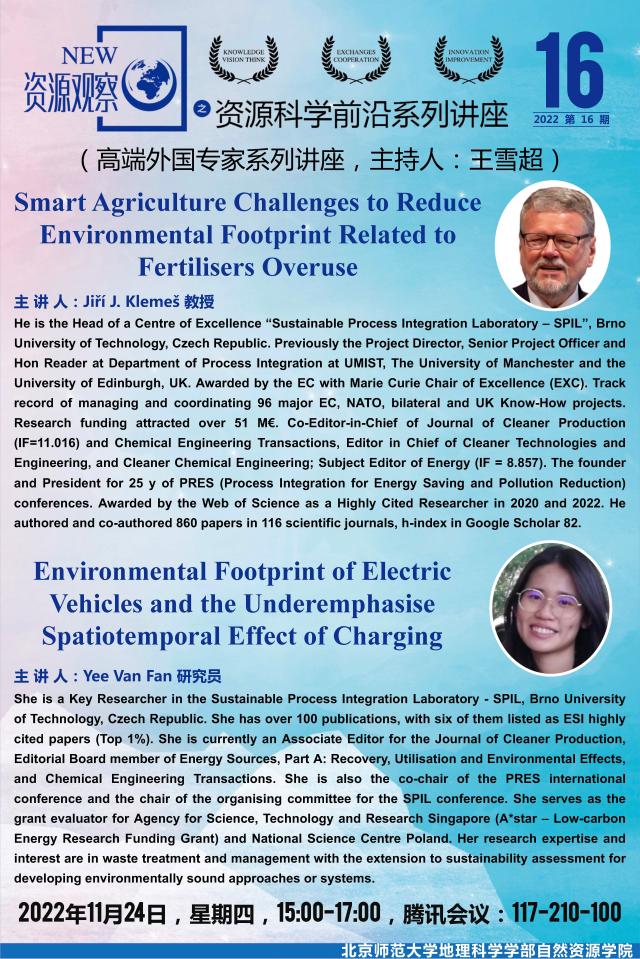 【11月24日讲座】Jiří J. Klemeš ,Smart Agriculture Challenges to Reduce Environmental Footprint Related to Fertilisers Overuse ; Yee Van Fan ,Environmental Footprint of Electric Vehicles and the Underemphasise Spatiotemporal Effect of Charging