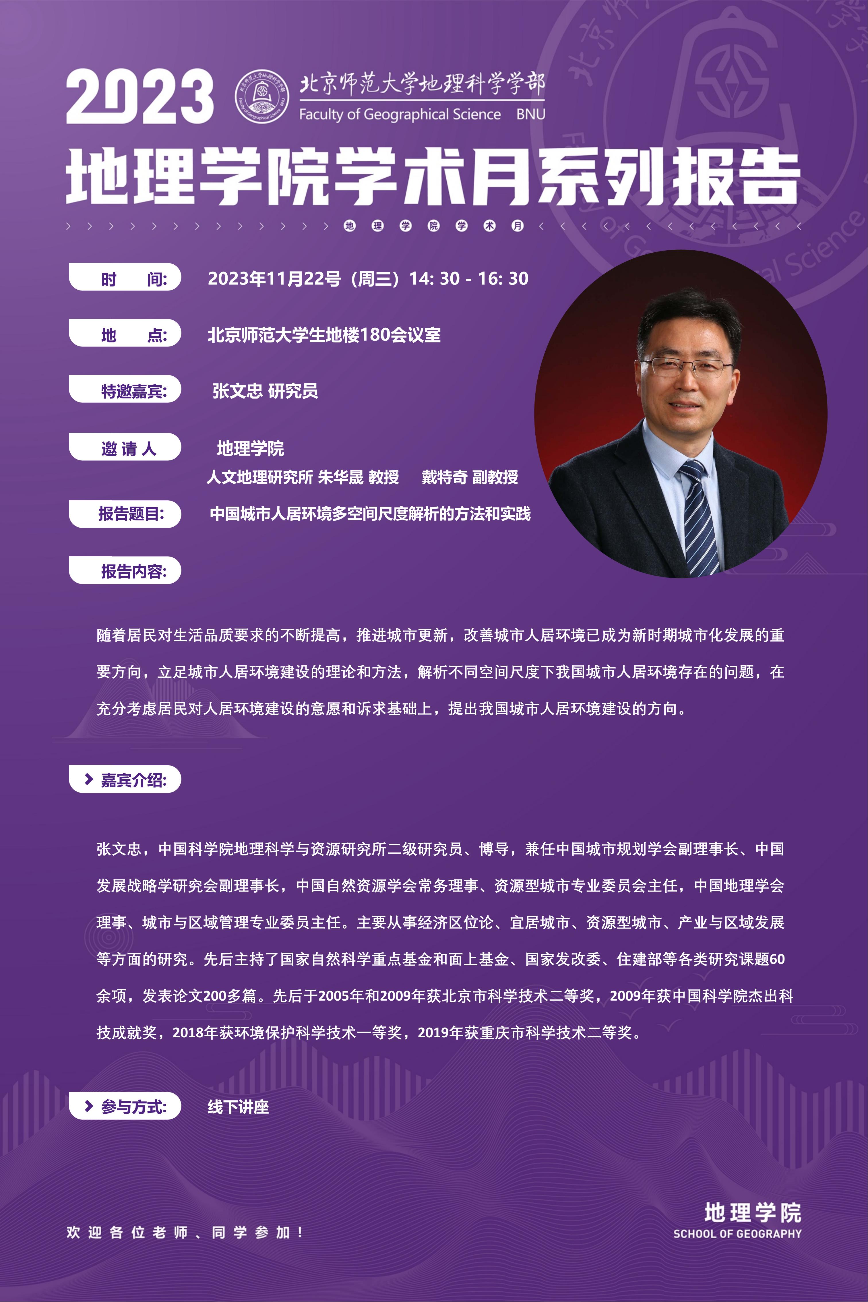 【11月22日】张文忠 研究员,中国城市人居环境多空间尺度解析的方法和实践