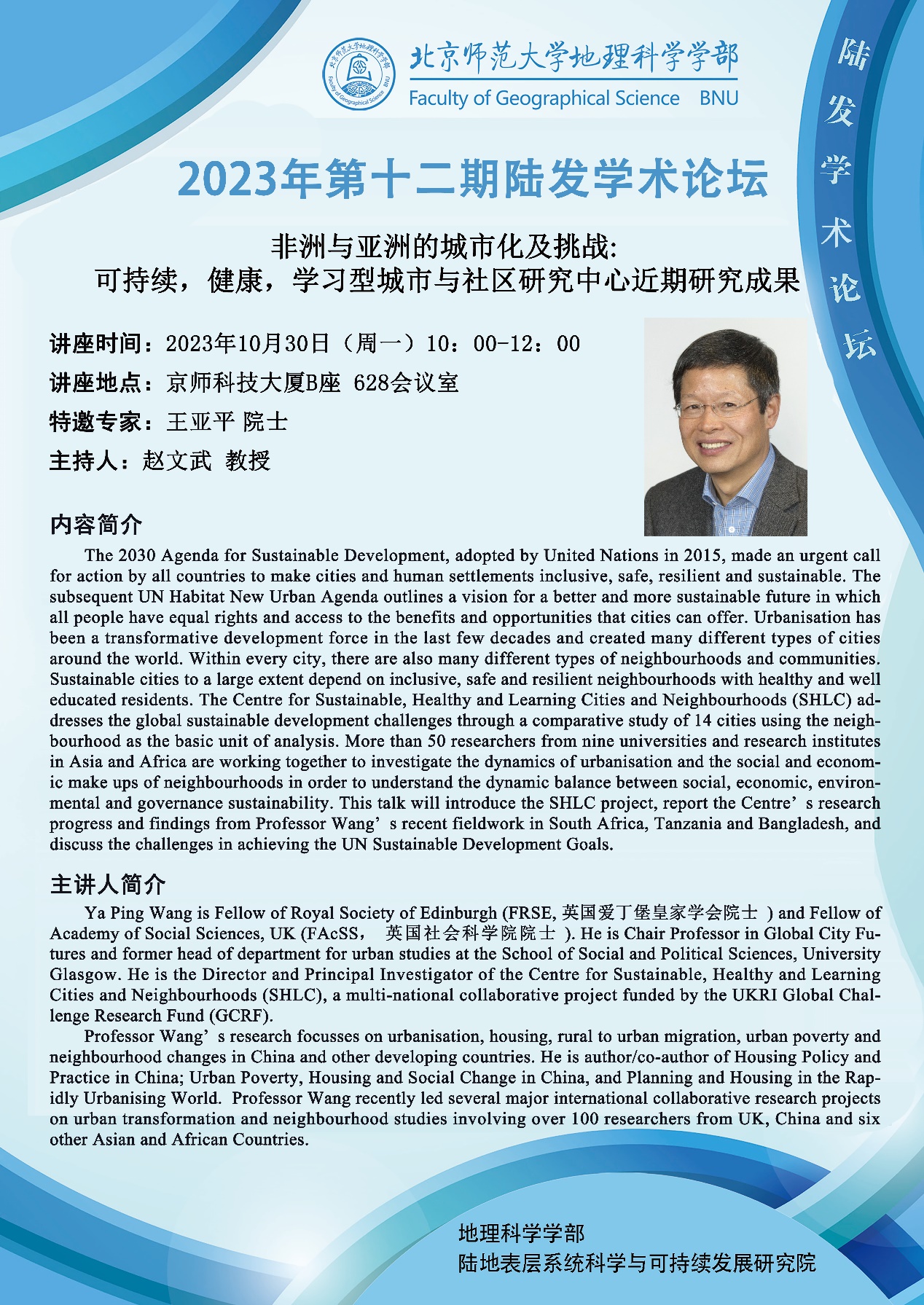 【10月30日】王亚平 院士,非洲与亚洲的城市化及挑战:可持续,健康,学习型城市与社区研究中心近期研究成果