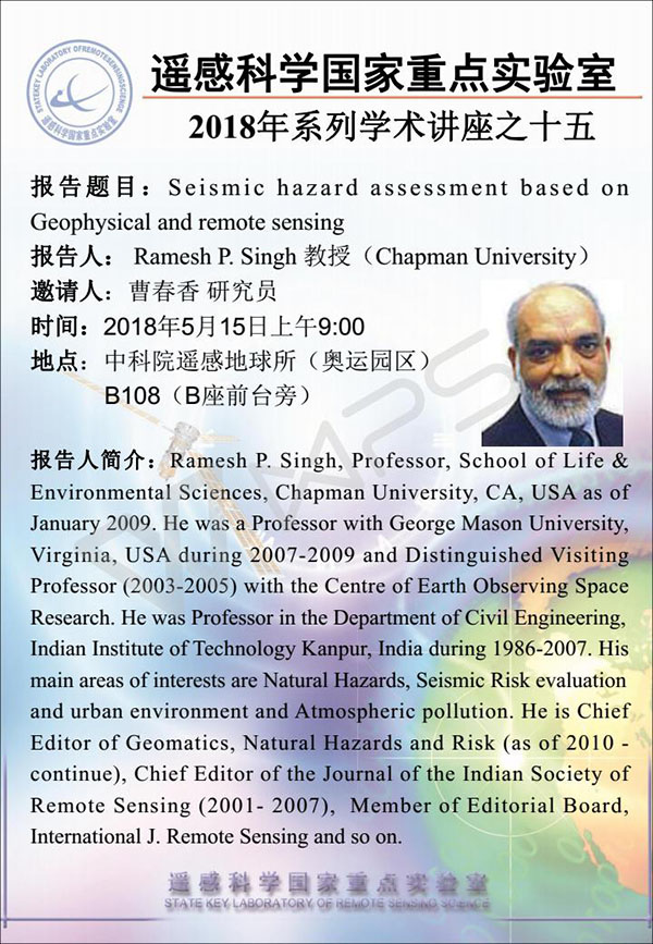 【5月15日讲座】Ramesh P. Singh,Seismic hazard assessment based on Geophysical and remote sensing