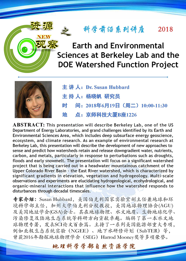 【6月19日讲座】Susan Hubbard:Earth and Environmental Sciences at Berkeley Lab and the DOE Watershed Function Project